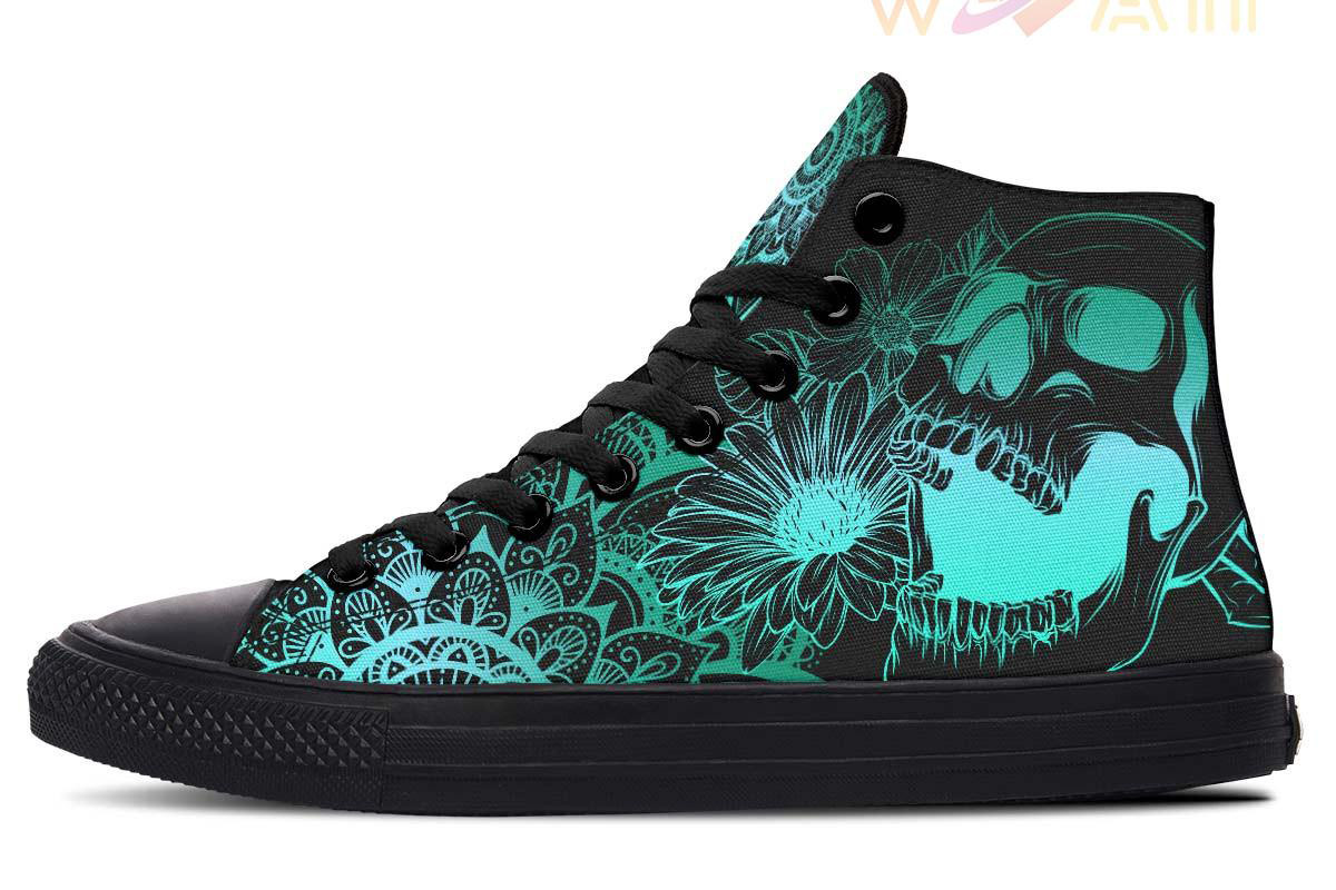 This Aqua Skull And Flowers High Top Canvas Shoes was originally designed to be basketball shoes. These women’s and men’s casual shoes have become the go to walking shoes for just about any situation.