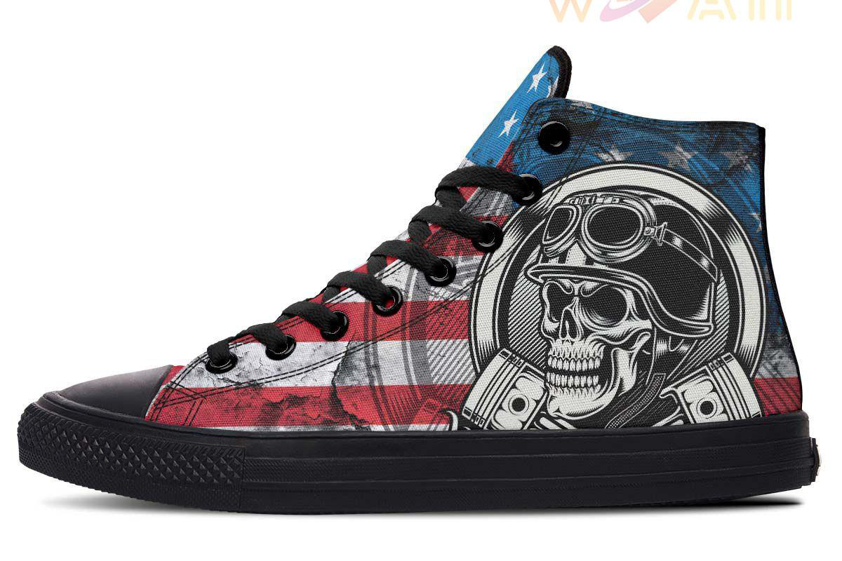 This Biker Flag Mechanic High Top Canvas Shoes was originally designed to be basketball shoes. These women’s and men’s casual shoes have become the go to walking shoes for just about any situation.