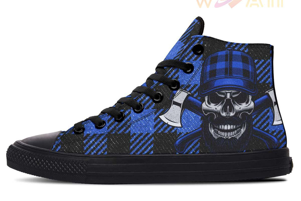 This Blue Lumberjack Skull High Top Canvas Shoes was originally designed to be basketball shoes. These women’s and men’s casual shoes have become the go to walking shoes for just about any situation.
