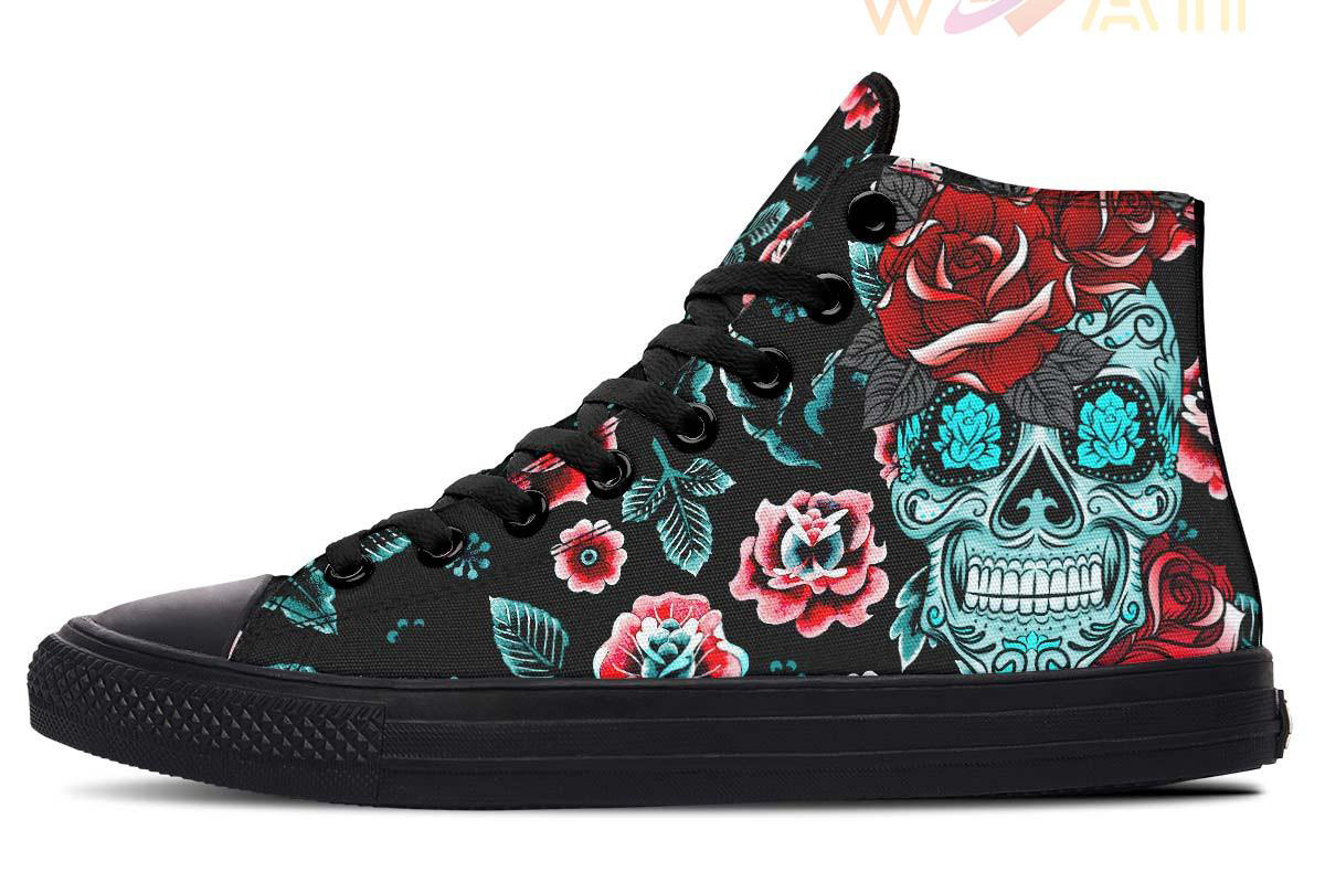 Blue Sugar Skull And Roses High Top Canvas Shoes
