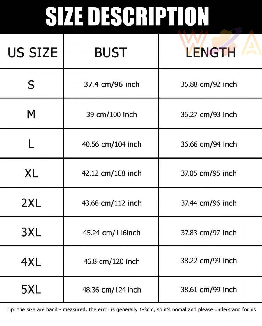 Size: S, M, L, XL, XXL, 3XL, 4XL, 5XL. Please check the size chart carefully before placing order as we CAN NOT offer return or refund if you choose a wrong size.