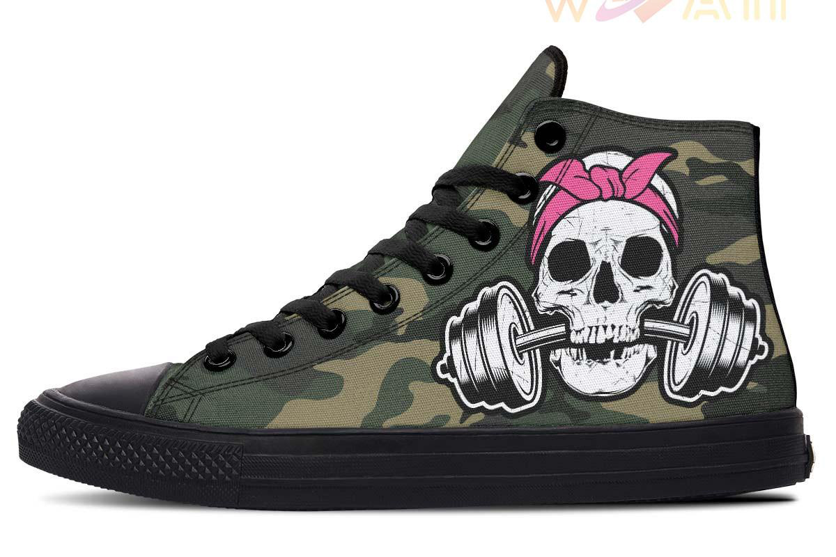This Dumbbell Skull Camo High Top Canvas Shoes was originally designed to be basketball shoes. These women’s and men’s casual shoes have become the go to walking shoes for just about any situation.