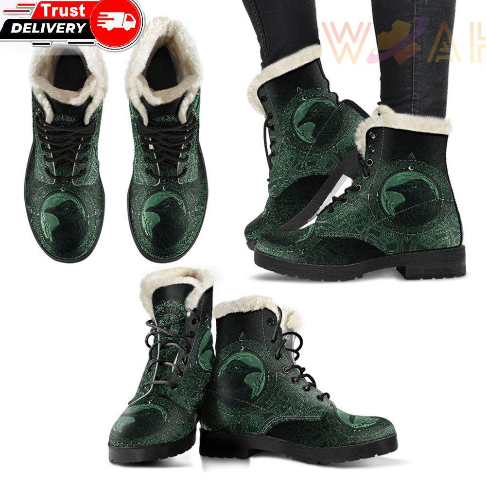 Faux Fur Leather Boots Ethnic Odin Raven Green A31