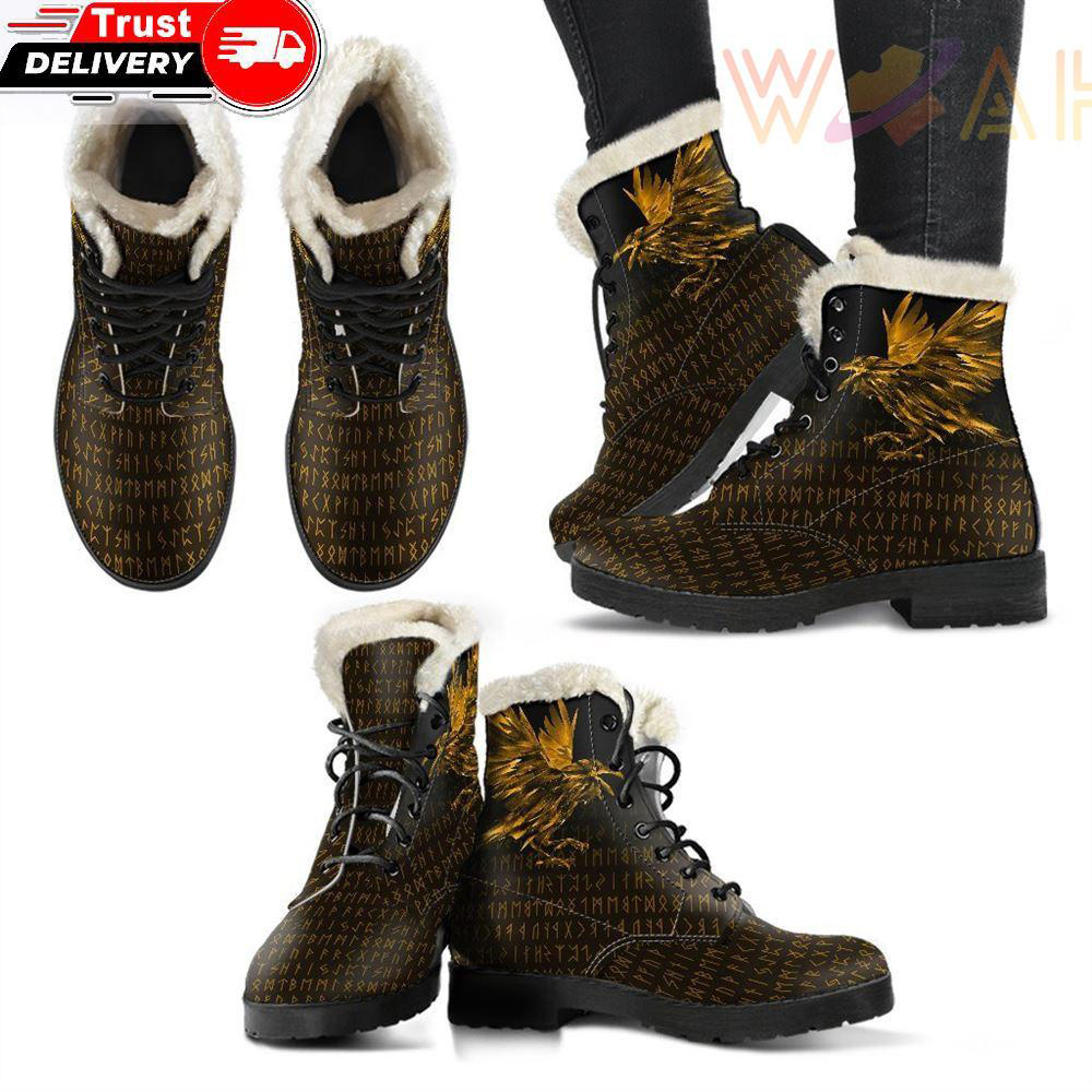 Faux Fur Leather Boots The Raven Of Odin Rune Gold