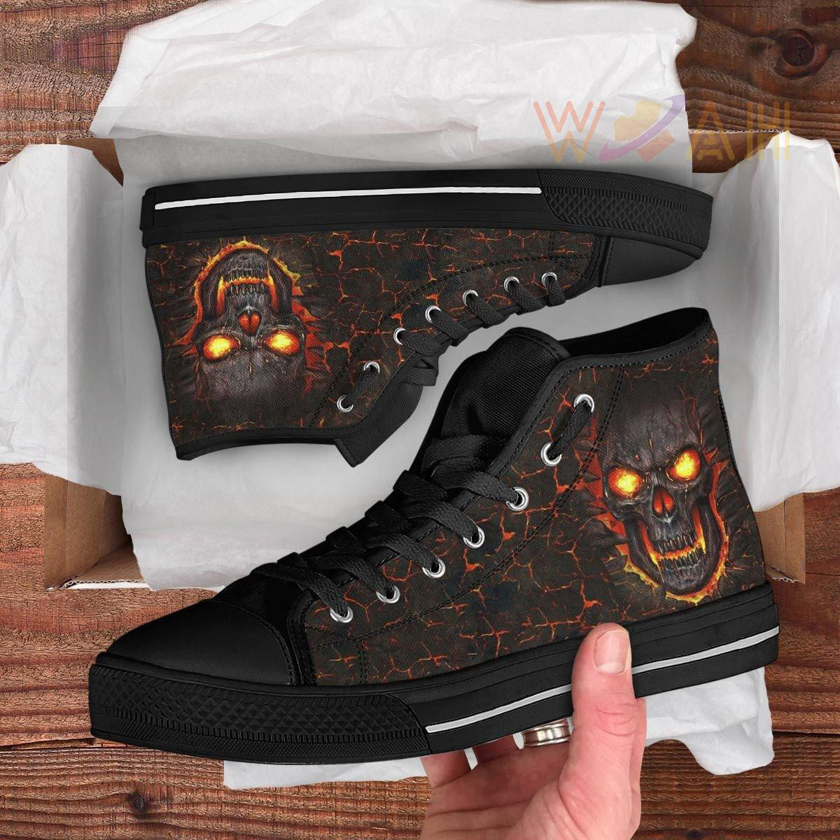 - The shoelaces run through these metal eyelets for added durability. Moreover, This high top shoes adds a bit of extra support and comfort bout more importantly, more space for your design the outer all over printed material is full canvas.