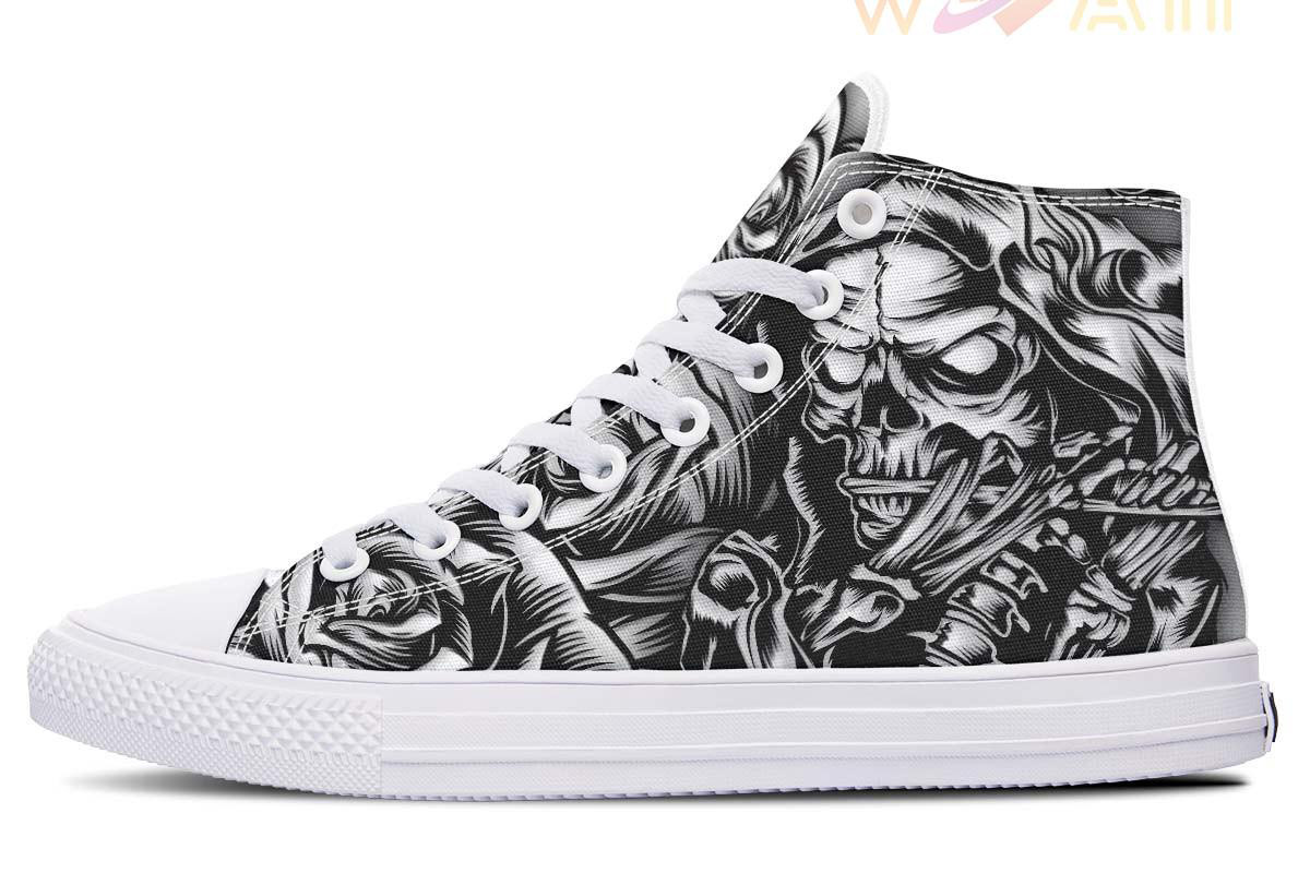 Grey Cartoon Skull Art High Top Canvas Shoes