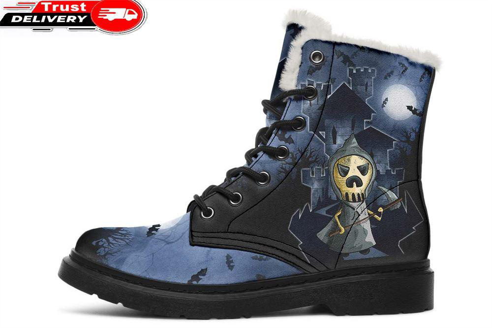 Grim Reaper Sketch Faux Fur Leather Boots