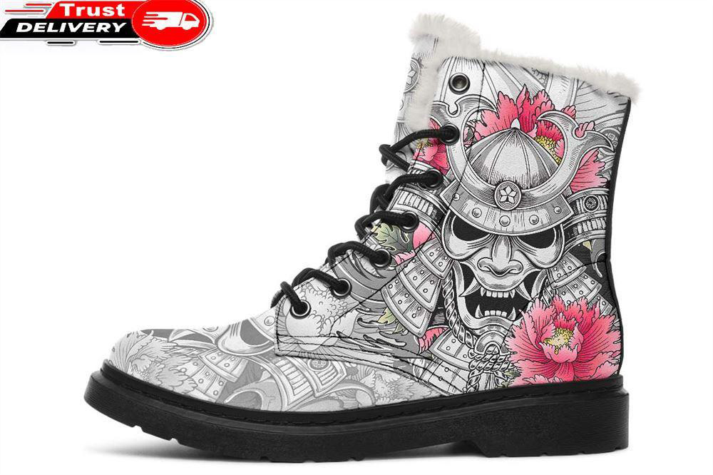 Kabuto And Pink Flowers Faux Fur Leather Boots
