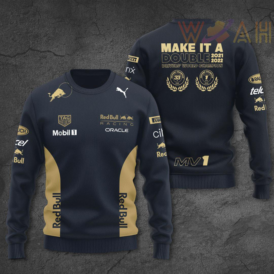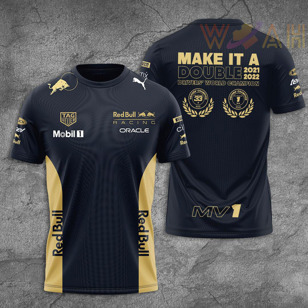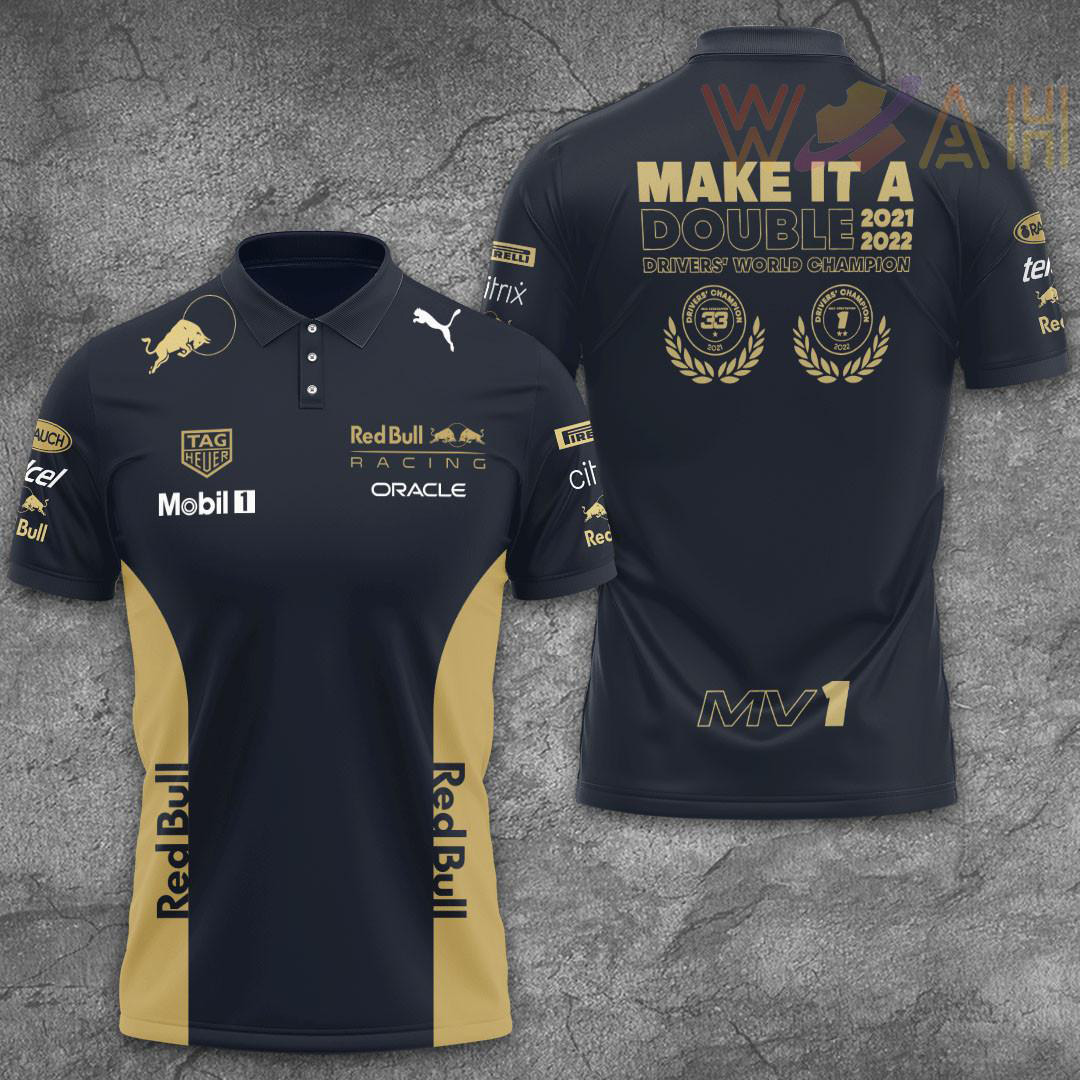 This Max Verstappen Make It A Double MV1 Polo, Sweatshirt, T-shirt, Hoodie, Zip-up Hoodie 3D will make a perfect gift for Red Bull Racing fans.