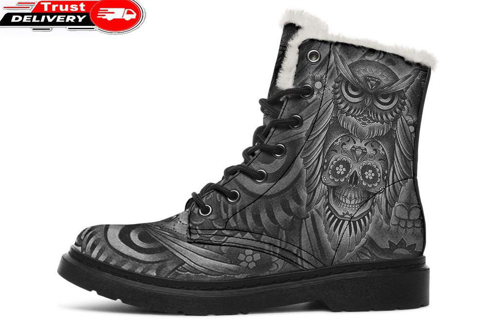 Owl And Candy Skull Faux Fur Leather Boots