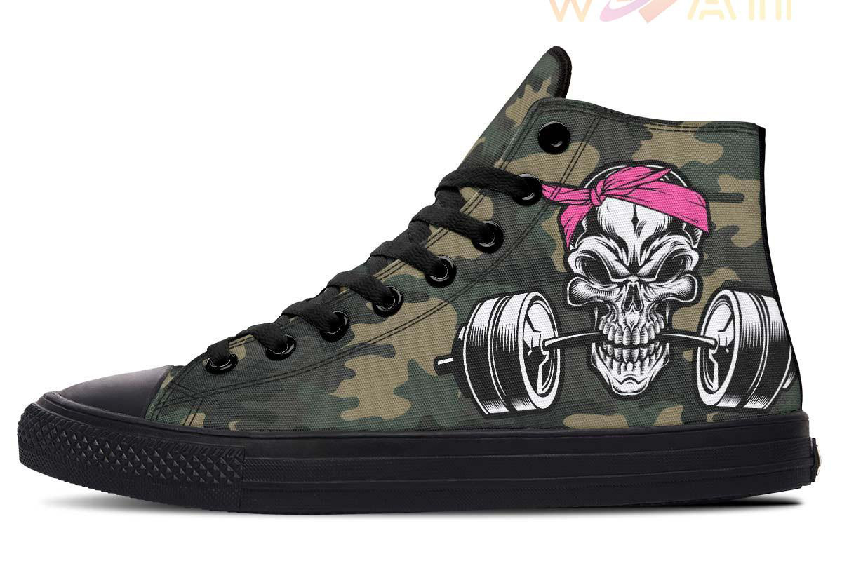 This Pink Bandana Dumbbell Skull High Top Canvas Shoes was originally designed to be basketball shoes. These women’s and men’s casual shoes have become the go to walking shoes for just about any situation.