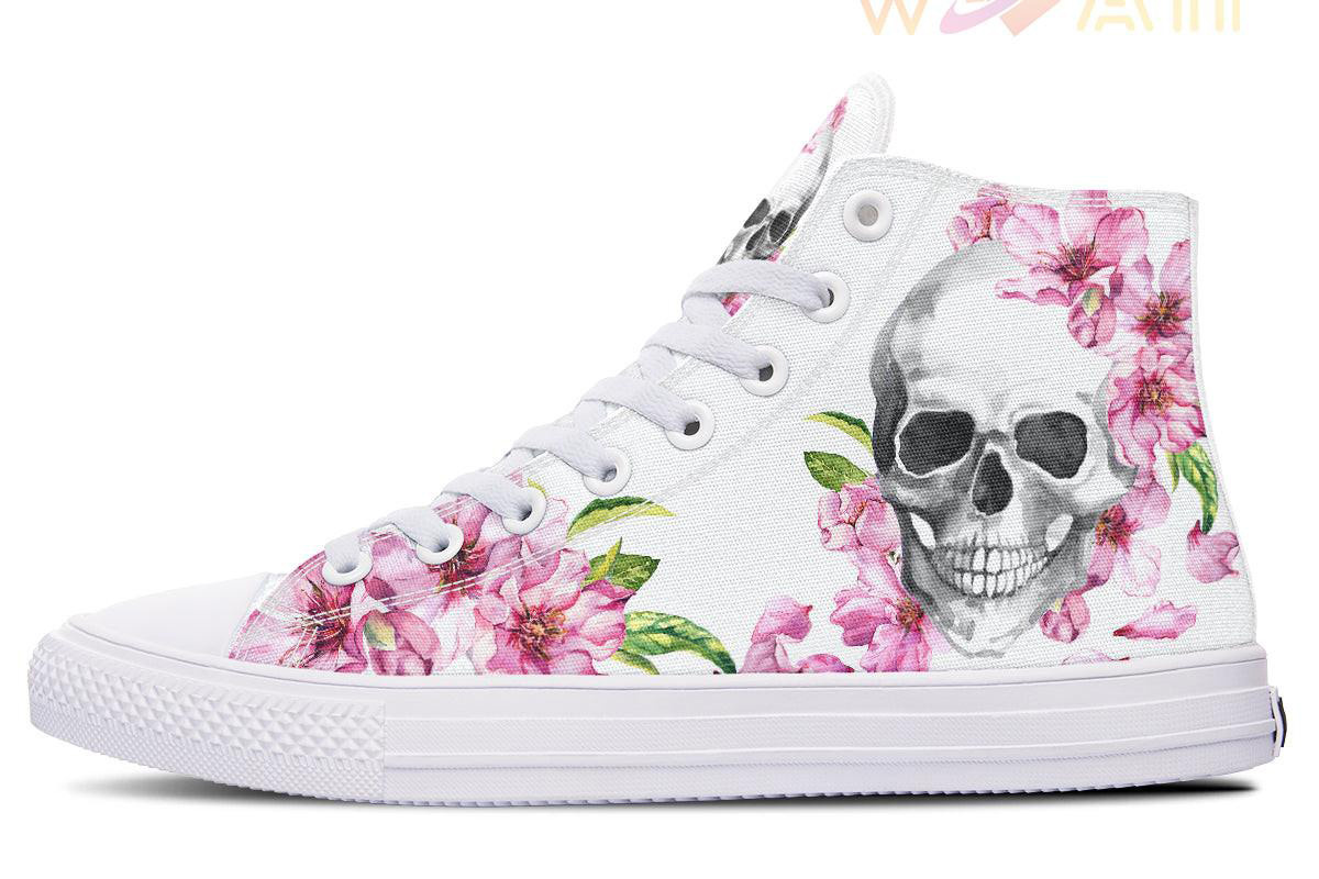 Pink Flower And Skull Painting High Top Canvas Shoes