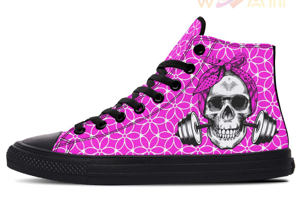 Pink Skull Dumbbell High Top Canvas Shoes