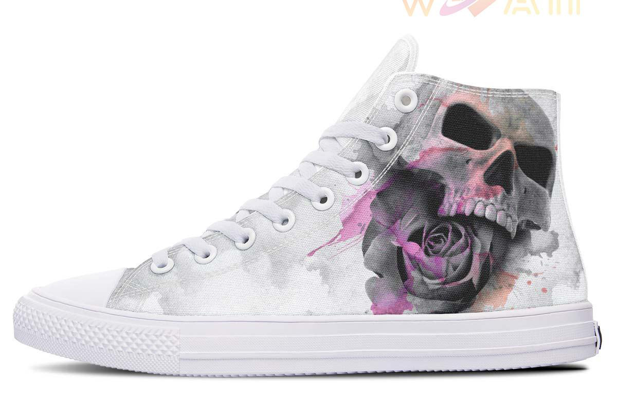 This Pink Splash Grey Skull High Top Canvas Shoes was originally designed to be basketball shoes. These women’s and men’s casual shoes have become the go to walking shoes for just about any situation.