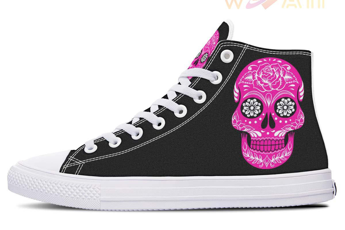 This Pink Sugar Skull High Top Canvas Shoes was originally designed to be basketball shoes. These women’s and men’s casual shoes have become the go to walking shoes for just about any situation.