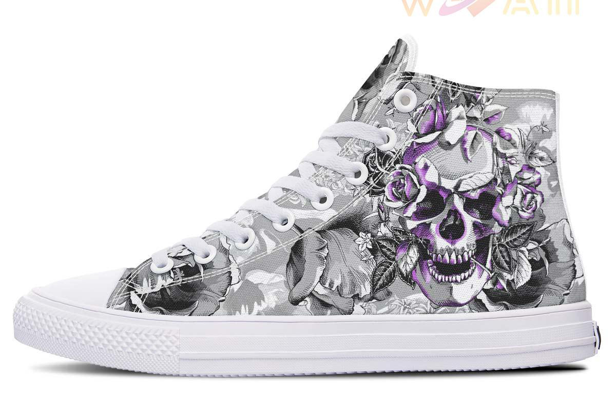 This Purple Skull And Flowers High Top Canvas Shoes was originally designed to be basketball shoes. These women’s and men’s casual shoes have become the go to walking shoes for just about any situation.