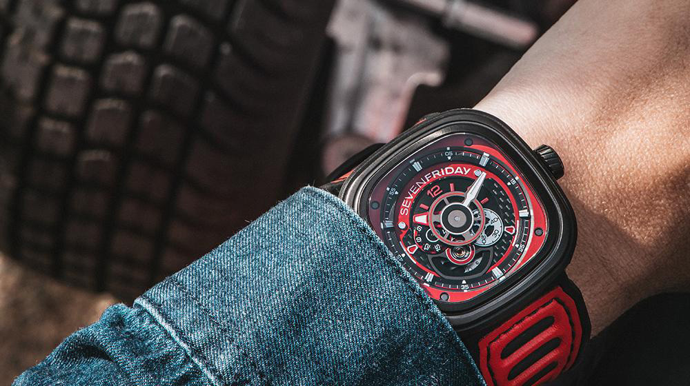 SEVENFRIDAY hits the road with the P3B/06 Red Racing Team. Constructed from the iconic P-Series and industrial engine inspired, the P3B/06 Red, is a symbol of the bond between man and machine. From the late-night cannonball runs through Tokyo’s Shubiya Crossing to daylong rallies through the windy roads of southern California, the P3B/06 Red is speeding to the finish line with a black silicone animation ring, carbon fiber interface and silicone and leather color-coordinated strap.