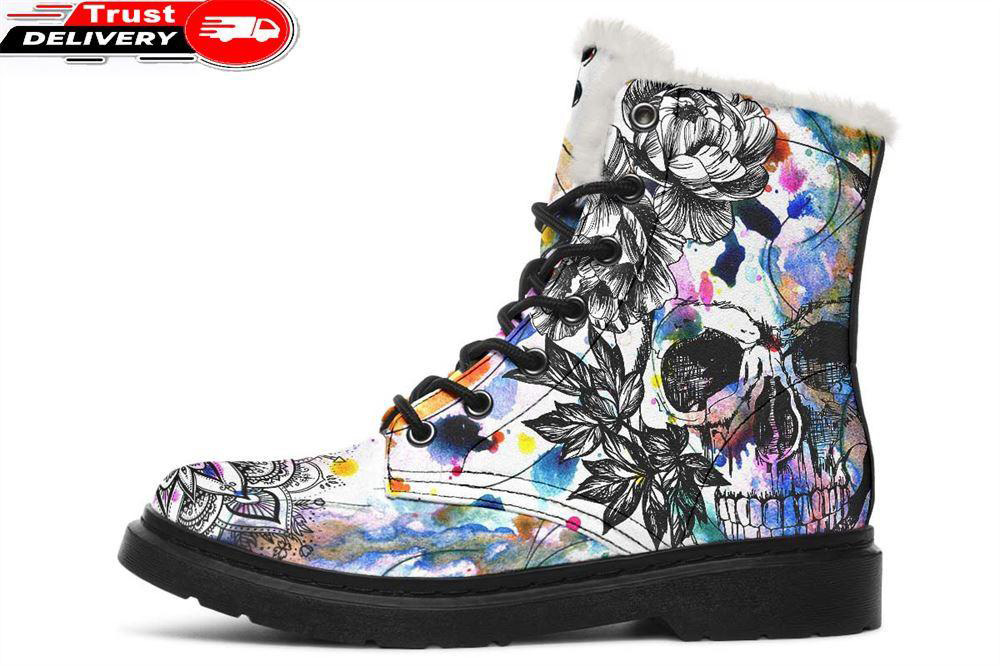 Skull And Mandala Watercolors Faux Fur Leather Boots