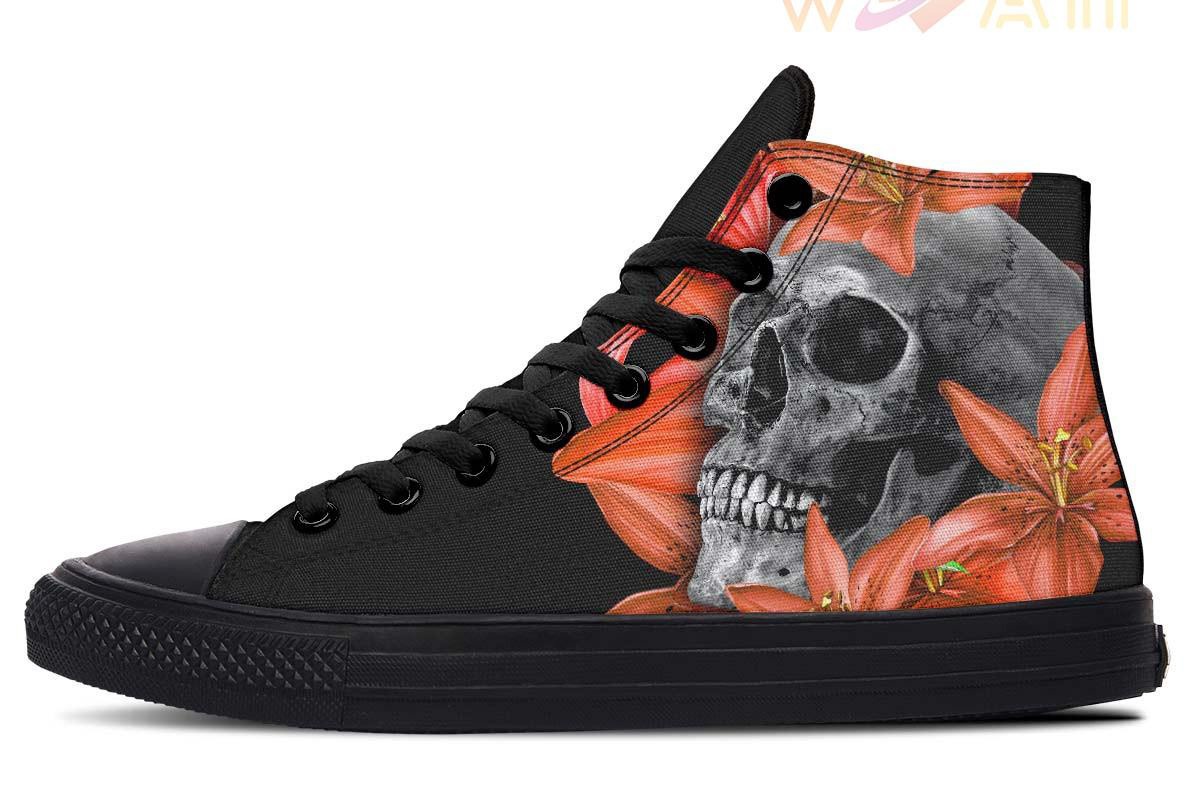 Skull And Red Lily Flowers High Top Canvas Shoes