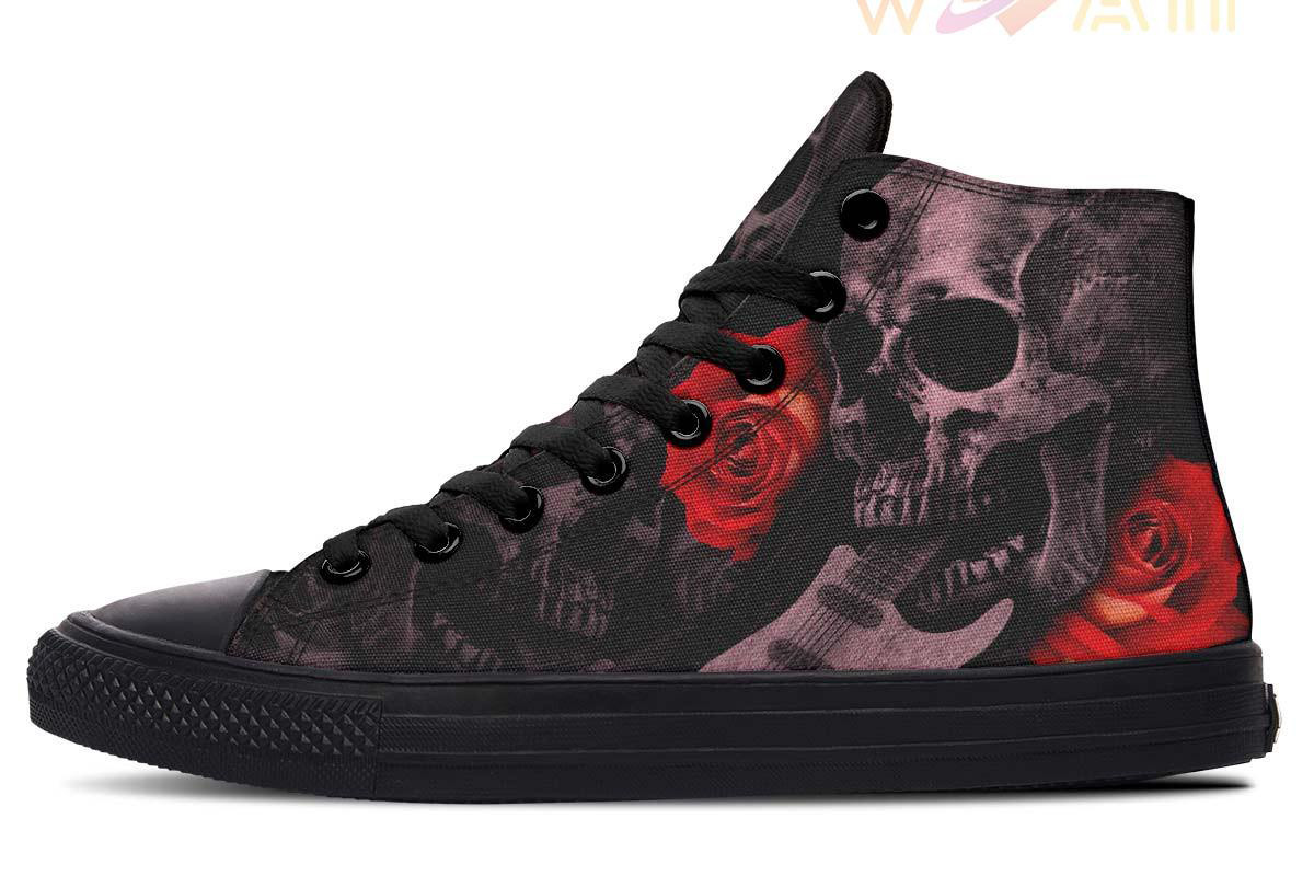 This Skull Biting Guitar High Top Canvas Shoes was originally designed to be basketball shoes. These women’s and men’s casual shoes have become the go to walking shoes for just about any situation.