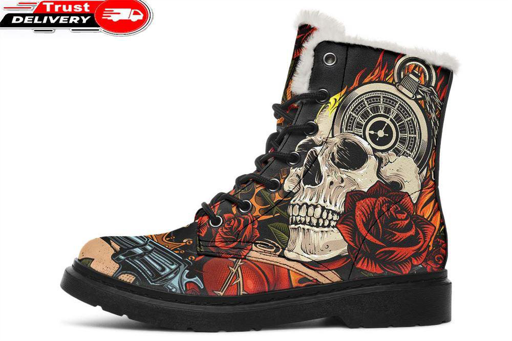 Skull Gun And Rose Faux Fur Leather Boots