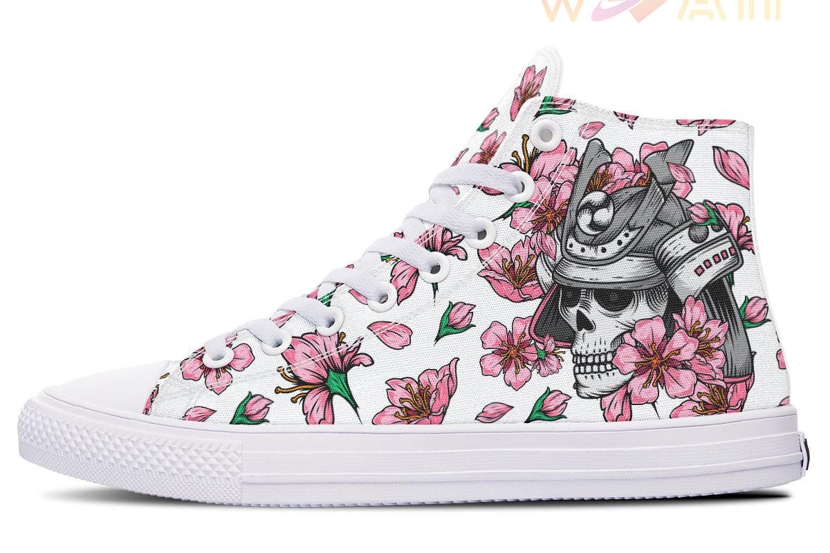 Skull Kabuto And Pink Blossom High Top Canvas Shoes