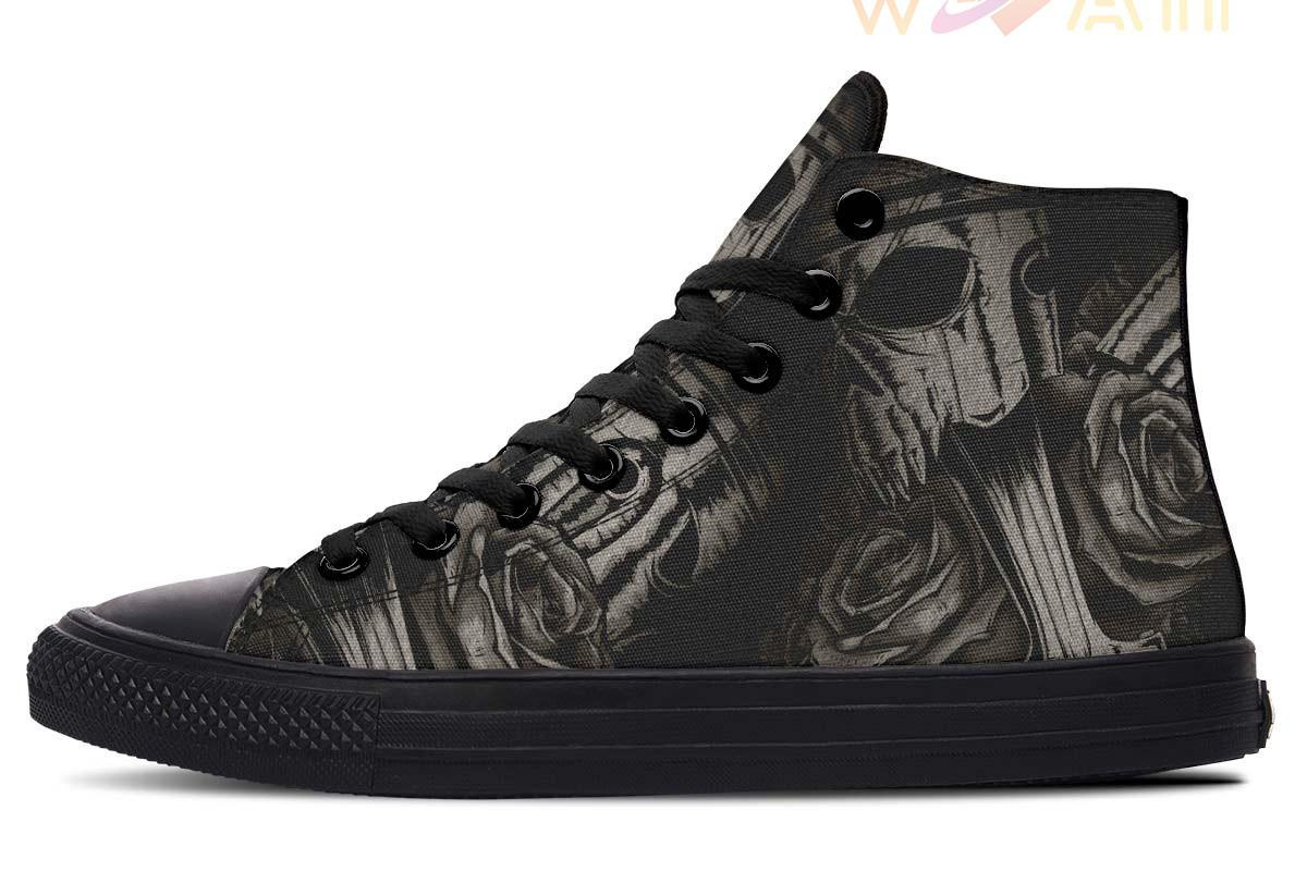This Skull Pistons And Roses High Top Canvas Shoes was originally designed to be basketball shoes. These women’s and men’s casual shoes have become the go to walking shoes for just about any situation.