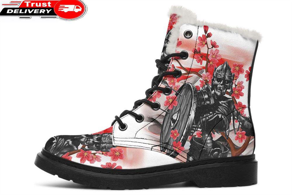 Skull Warrior And Red Flowers Faux Fur Leather Boots