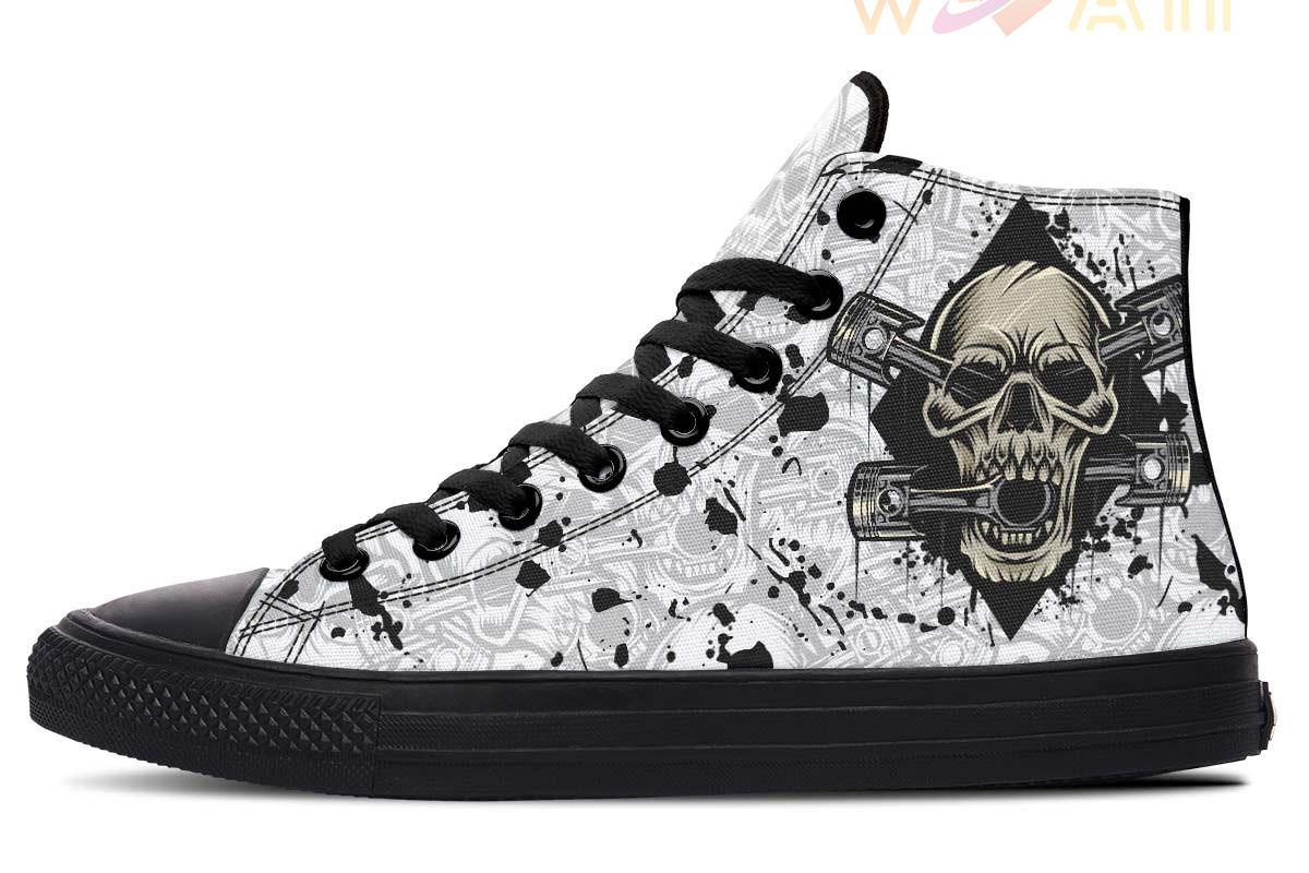This Skull With Piston High Top Canvas Shoes was originally designed to be basketball shoes. These women’s and men’s casual shoes have become the go to walking shoes for just about any situation.