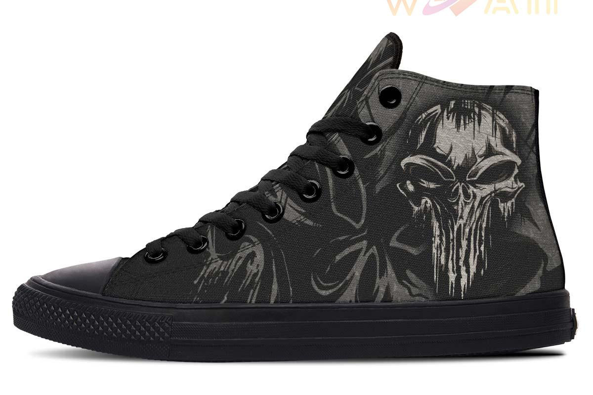 This Tattoo Punisher Background High Top Canvas Shoes was originally designed to be basketball shoes. These women’s and men’s casual shoes have become the go to walking shoes for just about any situation.