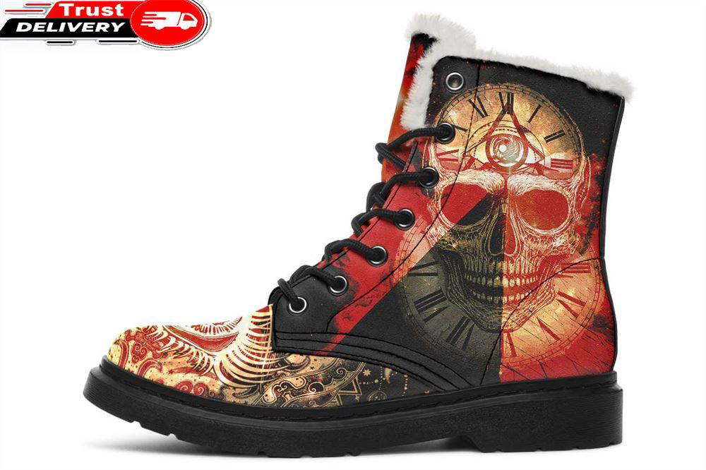 Tattoo Skull And Clock Faux Fur Leather Boots