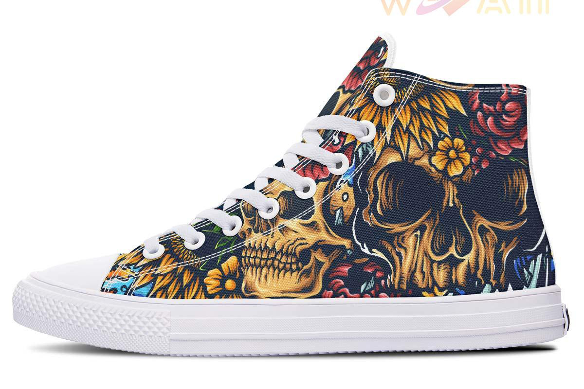 This Two Skull Tattoo High Top Canvas Shoes was originally designed to be basketball shoes. These women’s and men’s casual shoes have become the go to walking shoes for just about any situation.
