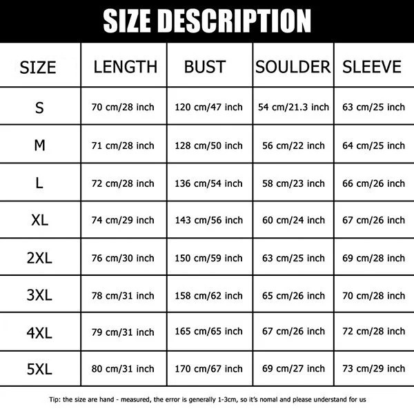 Size: S, M, L, XL, XXL, 3XL, 4XL, 5XL. Size Selection: Please review the size chart and measuring instructions carefully before placing your order. Unfortunately, we cannot accept returns or issue refunds for size-related issues if the wrong size is chosen.