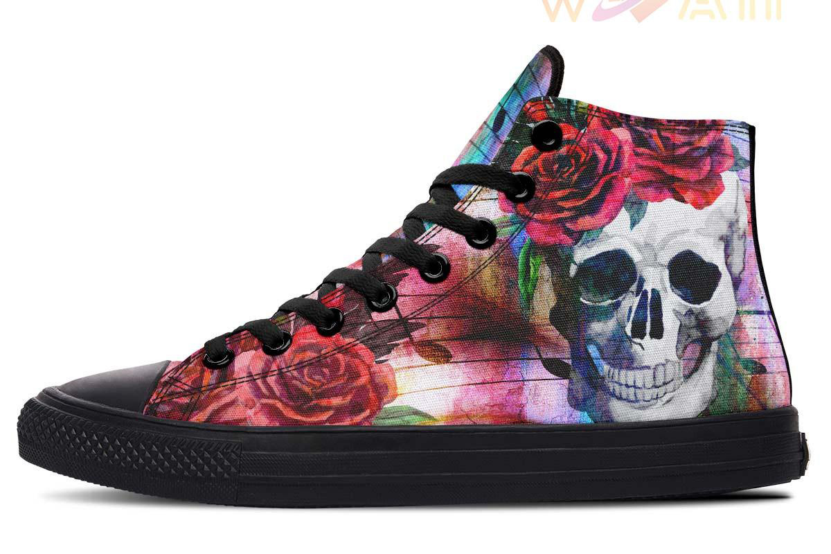 This Watercolor Skull And Music High Top Canvas Shoes was originally designed to be basketball shoes. These women’s and men’s casual shoes have become the go to walking shoes for just about any situation.