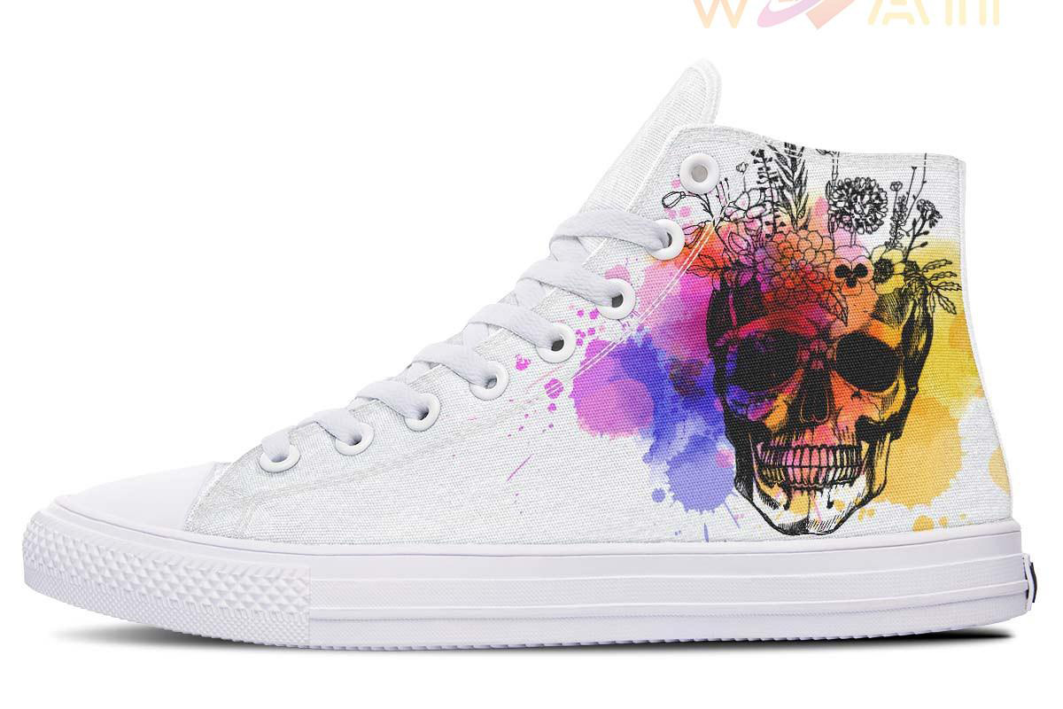 Watercolorful Skull And Flowers High Top Canvas Shoes